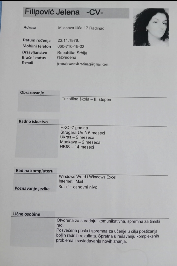 U svojoj struci nemsm radnog iskustva,ali mislim da mladost i entuzijazam mogu da doprinesu da posao obavljam i više nego korektno.Spremna sam na timski rad i otvorena za savete i primedbe starijih kolega.Sem maternjeg jezika govorim i engleski, osnovni nivo, učen tokom dugogodišnjeg školovanja u osnovnom, srednjem i višem obrazovanju, tako da mi komunikacija sa stranim državljanima neće biti otežavajuća okolnost.Napominjem da se ne bojim odgovornosti i da sam spremna na stručna usavršavanja
